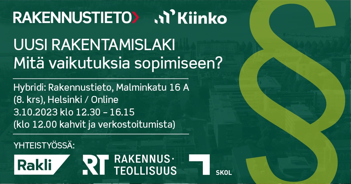Uusi rakentamislaki tuo hankkeen eri vaiheisiin uusia tehtäviä, jotka hankkeen osapuolien tulee ottaa huomioon sopimisessa. Rakennustieto Oy ja Kiinko järjestävät yhdessä Kiinteistönomistajat ja rakennuttajat Rakli ry:n, Rakennusteollisuus RT:n ja SKOL ry:n kanssa ajankohtaisen koulutuksen uuden lain aiheuttamista